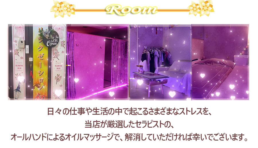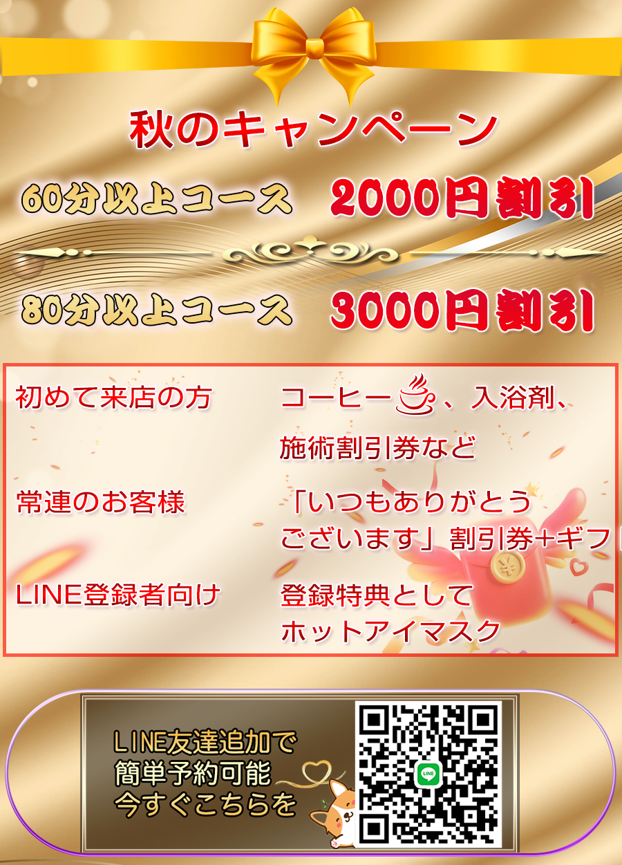 疲れた体に元気を与えます! 2025/10/26 マッサージ技術+おもてなし心+高い美意識を併せ持つ厳選されたセラピストが貴様の体調・お好みに応じて究極の癒しマッサージを提供させていただきます。個室の空間で全てを忘れセラピストのリズムに身を任せ貴様自身を取り戻してください疲れた体を癒しながらストレスの発散をし、健やかな状態を保ちます |